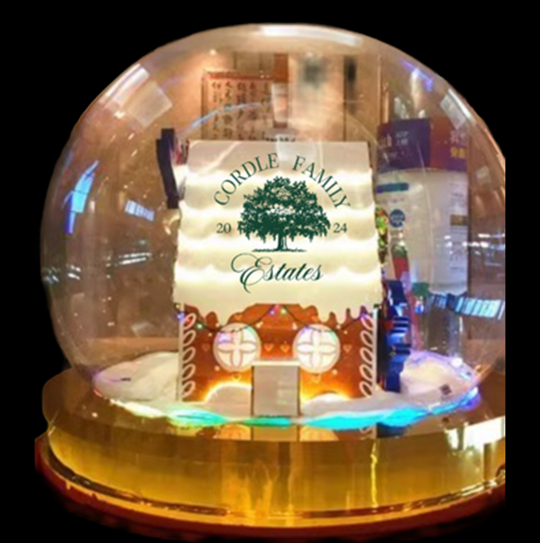 An 8 foot walk-around snow globe showcasing a detailed, illuminated holiday village.