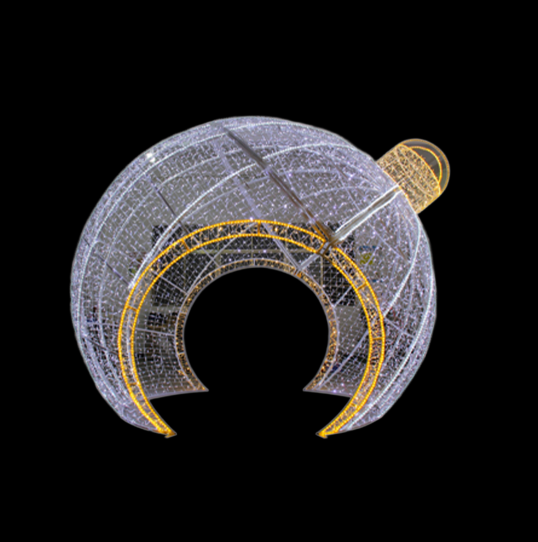 A 10 foot shimmering moon-shaped arch ideal for photo ops and elegant holiday entrances.